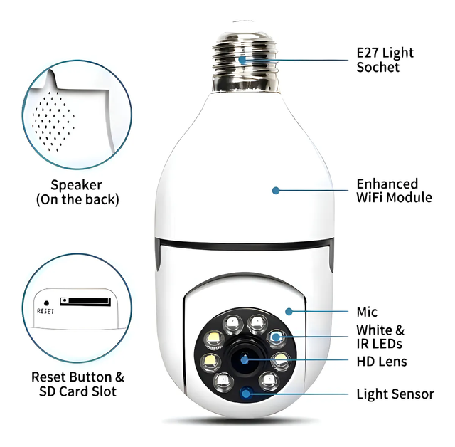 🌙📸Cámara inteligente 2MP con forma de bombilla combina seguridad y discreción en un solo dispositivo. Conéctala fácilmente al portalámparas E27 y contrólala desde tu celular 📱.